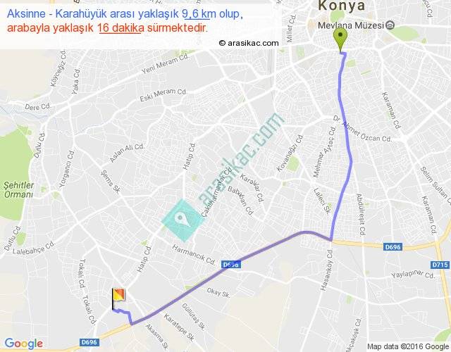 Aksinne - Karahüyük arası yaklaşık olarak 90 km/h ile yukarıda belirtilen sürede olup, iki yerin kuş uçuşu uzaklığı (mesafesi) 7'dir. Yolculuk otobüsle 20 dakika sürmektedir.