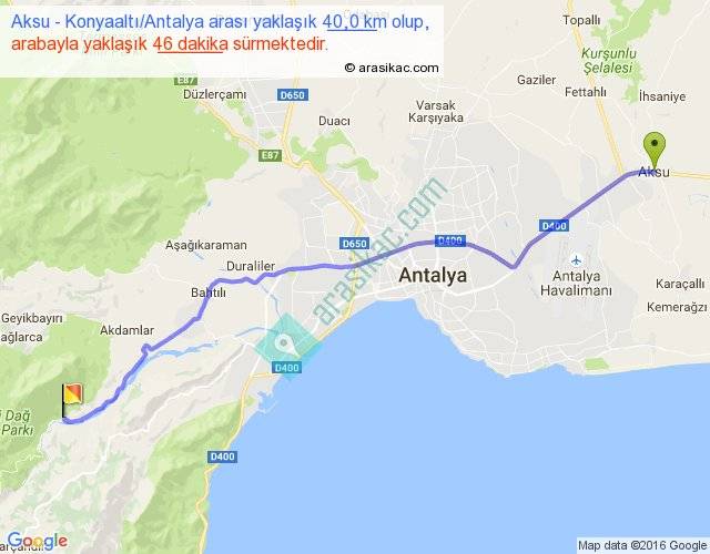 Aksu - Konyaaltı Antalya arası yaklaşık olarak 90 km/h ile yukarıda belirtilen sürede olup, iki yerin kuş uçuşu uzaklığı (mesafesi) 35'dir. Yolculuk otobüsle 59 dakika sürmektedir.
