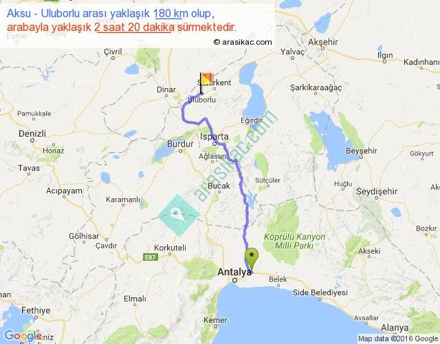 Aksu - Uluborlu arası yaklaşık olarak 90 km/h ile yukarıda belirtilen sürede olup, iki yerin kuş uçuşu uzaklığı (mesafesi) 130'dir. Yolculuk otobüsle 3 saat 2 dakika sürmektedir.
