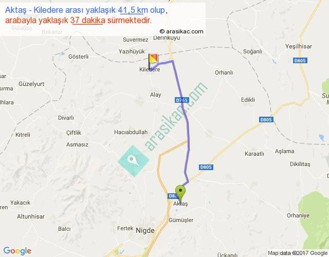 Aktaş - Kiledere arası yaklaşık olarak 90 km/h ile yukarıda belirtilen sürede olup, iki yerin kuş uçuşu uzaklığı (mesafesi) 32'dir. Yolculuk otobüsle 48 dakika sürmektedir.