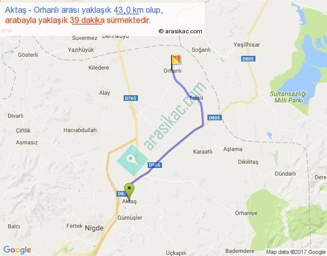 Aktaş - Orhanlı arası yaklaşık olarak 90 km/h ile yukarıda belirtilen sürede olup, iki yerin kuş uçuşu uzaklığı (mesafesi) 32'dir. Yolculuk otobüsle 50 dakika sürmektedir.