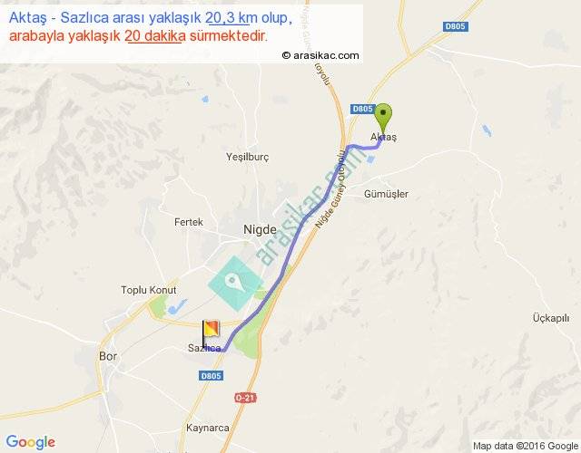Aktaş - Sazlıca arası yaklaşık olarak 90 km/h ile yukarıda belirtilen sürede olup, iki yerin kuş uçuşu uzaklığı (mesafesi) 18'dir. Yolculuk otobüsle 26 dakika sürmektedir.