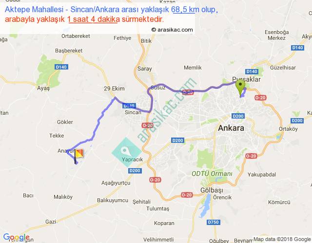 Aktepe Mahallesi - Sincan Ankara arası yaklaşık olarak 90 km/h ile yukarıda belirtilen sürede olup, iki yerin kuş uçuşu uzaklığı (mesafesi) 42'dir. Yolculuk otobüsle 1 saat 23 dakika sürmektedir.