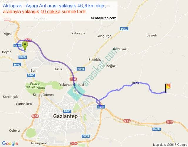 Aktoprak - Aşağı Arıl arası yaklaşık olarak 90 km/h ile yukarıda belirtilen sürede olup, iki yerin kuş uçuşu uzaklığı (mesafesi) 30'dir. Yolculuk otobüsle 52 dakika sürmektedir.
