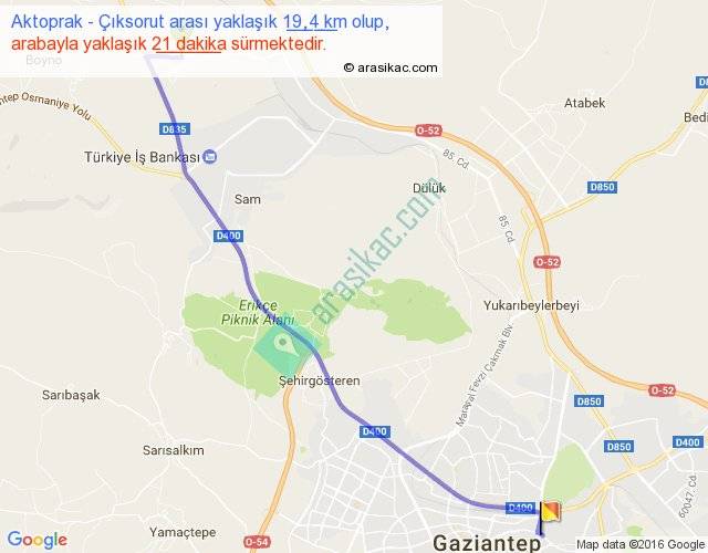 Aktoprak - Çıksorut arası yaklaşık olarak 90 km/h ile yukarıda belirtilen sürede olup, iki yerin kuş uçuşu uzaklığı (mesafesi) 16'dir. Yolculuk otobüsle 27 dakika sürmektedir.