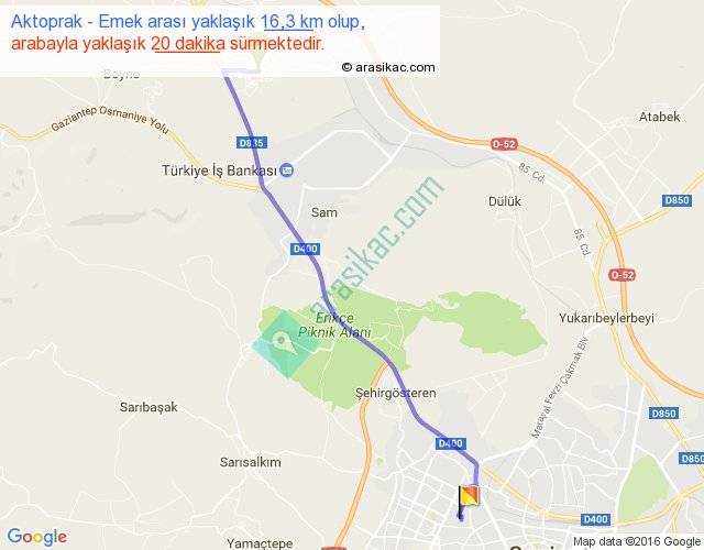Aktoprak - Emek arası yaklaşık olarak 90 km/h ile yukarıda belirtilen sürede olup, iki yerin kuş uçuşu uzaklığı (mesafesi) 14'dir. Yolculuk otobüsle 26 dakika sürmektedir.