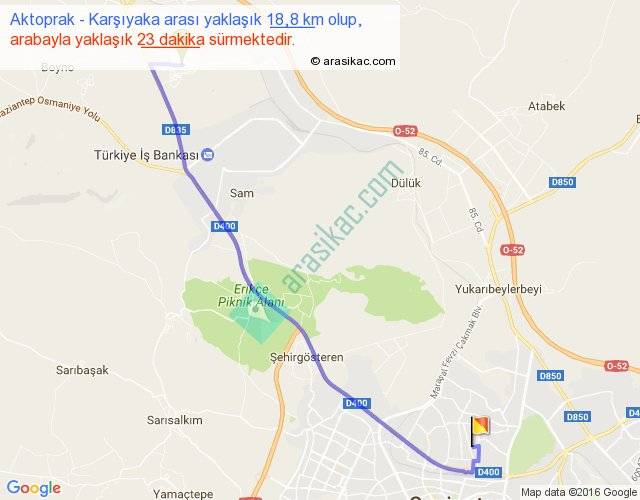 Aktoprak - Karşıyaka arası yaklaşık olarak 90 km/h ile yukarıda belirtilen sürede olup, iki yerin kuş uçuşu uzaklığı (mesafesi) 15'dir. Yolculuk otobüsle 29 dakika sürmektedir.