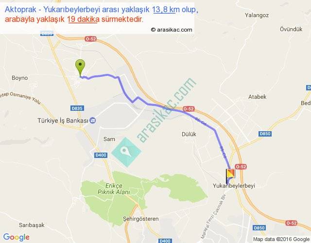 Aktoprak - Yukarıbeylerbeyi arası yaklaşık olarak 90 km/h ile yukarıda belirtilen sürede olup, iki yerin kuş uçuşu uzaklığı (mesafesi) 11'dir. Yolculuk otobüsle 24 dakika sürmektedir.