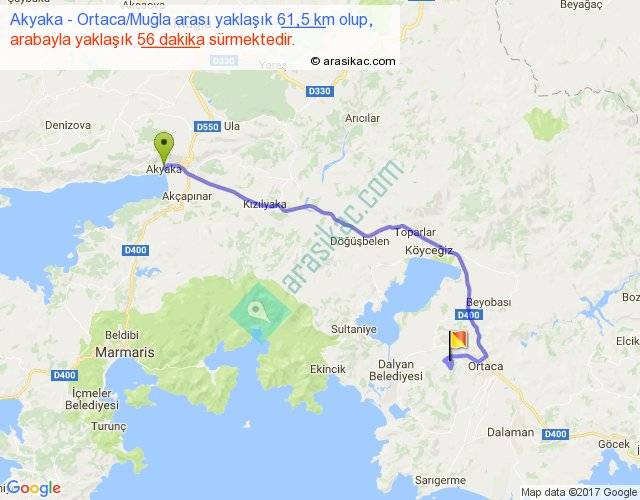 Akyaka - Ortaca Muğla arası yaklaşık olarak 90 km/h ile yukarıda belirtilen sürede olup, iki yerin kuş uçuşu uzaklığı (mesafesi) 42'dir. Yolculuk otobüsle 1 saat 12 dakika sürmektedir.