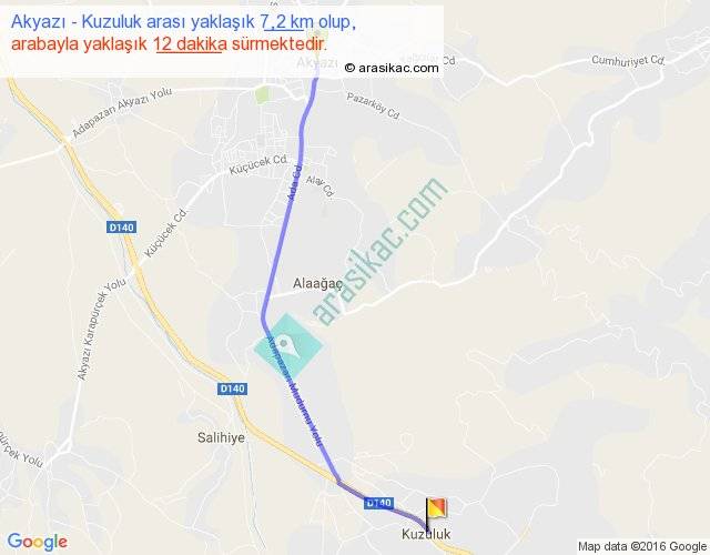 Akyazı - Kuzuluk arası yaklaşık olarak 90 km/h ile yukarıda belirtilen sürede olup, iki yerin kuş uçuşu uzaklığı (mesafesi) 6'dir. Yolculuk otobüsle 15 dakika sürmektedir.