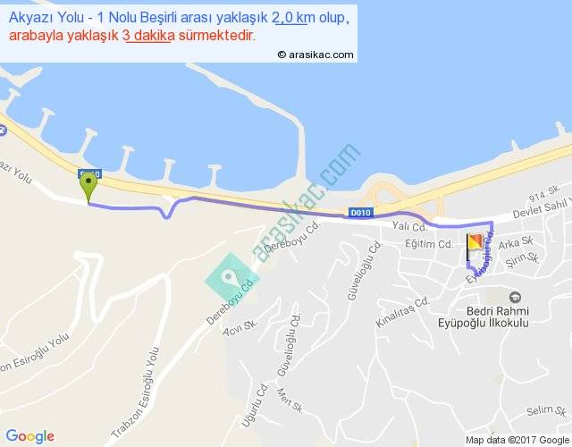 Akyazı Yolu - 1 Nolu Beşirli arası yaklaşık olarak 90 km/h ile yukarıda belirtilen sürede olup, iki yerin kuş uçuşu uzaklığı (mesafesi) 2'dir. Yolculuk otobüsle 3 dakika sürmektedir.