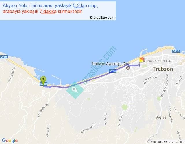 Akyazı Yolu - İnönü arası yaklaşık olarak 90 km/h ile yukarıda belirtilen sürede olup, iki yerin kuş uçuşu uzaklığı (mesafesi) 5'dir. Yolculuk otobüsle 9 dakika sürmektedir.