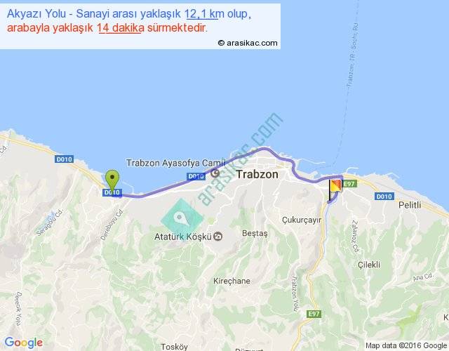 Akyazı Yolu - Sanayi arası yaklaşık olarak 90 km/h ile yukarıda belirtilen sürede olup, iki yerin kuş uçuşu uzaklığı (mesafesi) 9'dir. Yolculuk otobüsle 18 dakika sürmektedir.