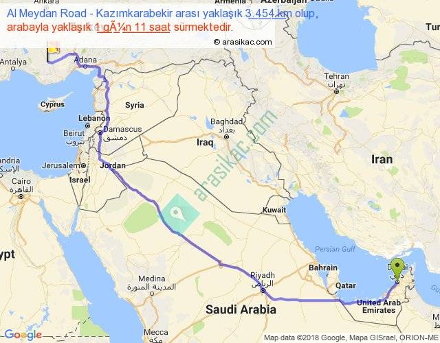 Al Meydan Road - Kazımkarabekir arası yaklaşık olarak 90 km/h ile yukarıda belirtilen sürede olup, iki yerin kuş uçuşu uzaklığı (mesafesi) 2489'dir. Eğer belirtilen yerler arasında uçak seferi var ise bu süre uçakla 3 saat 49 dakika'ya kadar düşebilir. Yolculuk otobüsle 1 gün 21 saat sürmektedir.