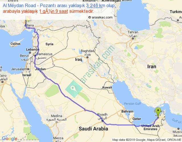 Al Meydan Road - Pozantı arası yaklaşık olarak 90 km/h ile yukarıda belirtilen sürede olup, iki yerin kuş uçuşu uzaklığı (mesafesi) 2350'dir. Eğer belirtilen yerler arasında uçak seferi var ise bu süre uçakla 3 saat 36 dakika'ya kadar düşebilir. Yolculuk otobüsle 1 gün 18 saat sürmektedir.