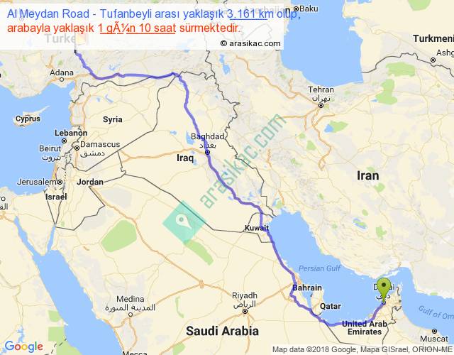 Al Meydan Road - Tufanbeyli arası yaklaşık olarak 90 km/h ile yukarıda belirtilen sürede olup, iki yerin kuş uçuşu uzaklığı (mesafesi) 2298'dir. Eğer belirtilen yerler arasında uçak seferi var ise bu süre uçakla 3 saat 32 dakika'ya kadar düşebilir. Yolculuk otobüsle 1 gün 20 saat sürmektedir.