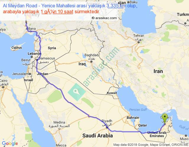 Al Meydan Road - Yenice Mahallesi arası yaklaşık olarak 90 km/h ile yukarıda belirtilen sürede olup, iki yerin kuş uçuşu uzaklığı (mesafesi) 2395'dir. Eğer belirtilen yerler arasında uçak seferi var ise bu süre uçakla 3 saat 41 dakika'ya kadar düşebilir. Yolculuk otobüsle 1 gün 20 saat sürmektedir.