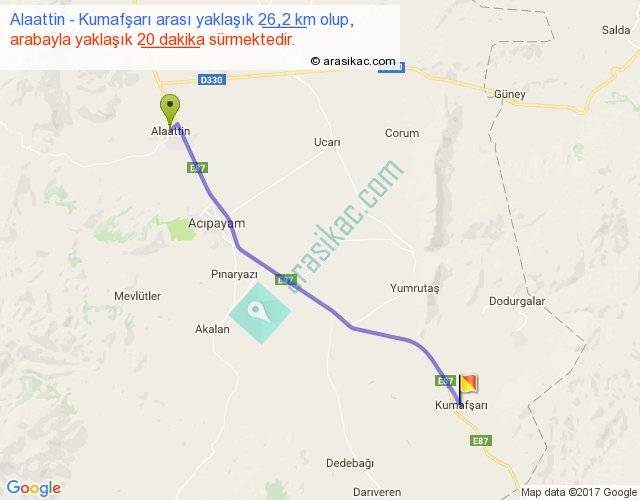 Alaattin - Kumafşarı arası yaklaşık olarak 90 km/h ile yukarıda belirtilen sürede olup, iki yerin kuş uçuşu uzaklığı (mesafesi) 24'dir. Yolculuk otobüsle 26 dakika sürmektedir.