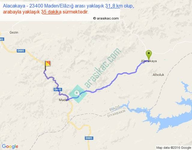 Alacakaya - 23400 Maden Elâzığ arası yaklaşık olarak 90 km/h ile yukarıda belirtilen sürede olup, iki yerin kuş uçuşu uzaklığı (mesafesi) 21'dir. Yolculuk otobüsle 45 dakika sürmektedir.