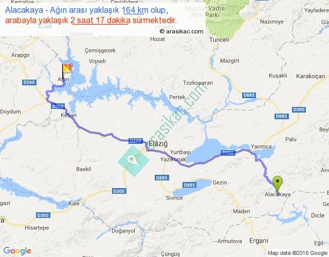 Alacakaya - Ağın arası yaklaşık olarak 90 km/h ile yukarıda belirtilen sürede olup, iki yerin kuş uçuşu uzaklığı (mesafesi) 112'dir. Yolculuk otobüsle 2 saat 58 dakika sürmektedir.