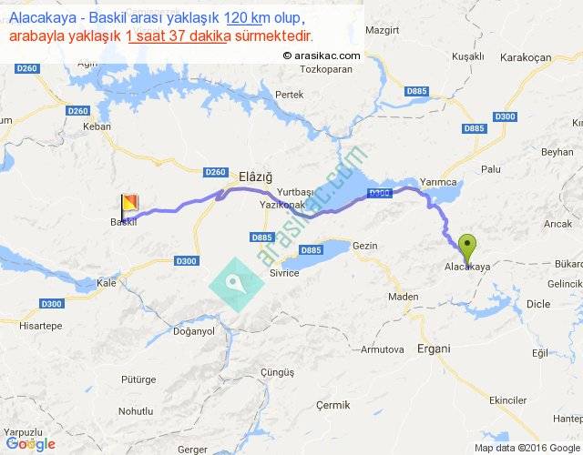 Alacakaya - Baskil arası yaklaşık olarak 90 km/h ile yukarıda belirtilen sürede olup, iki yerin kuş uçuşu uzaklığı (mesafesi) 91'dir. Yolculuk otobüsle 2 saat 6 dakika sürmektedir.