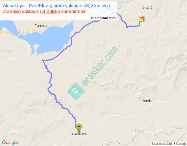 Alacakaya - Palu Elazığ arası yaklaşık olarak 90 km/h ile yukarıda belirtilen sürede olup, iki yerin kuş uçuşu uzaklığı (mesafesi) 25'dir. Yolculuk otobüsle 1 saat 10 dakika sürmektedir.
