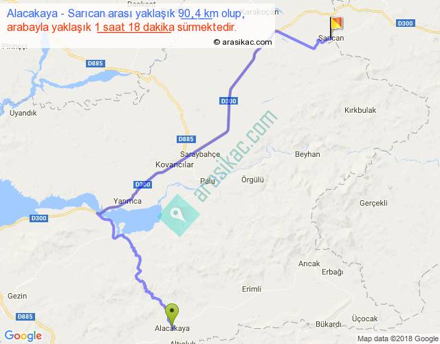 Eğer Alacakaya Sarıcan arası ne kadar yakar (benzin/mazot) diyorsanız, kilometrede 3 ₺ yakan bir aracınız var ise 270, km'de 4 ₺ yakan bir aracınız var ise 360, km'de 5 ₺ yakan bir aracınız var ise 450 ile bu yolculuğu tamamlayabilirsiniz.