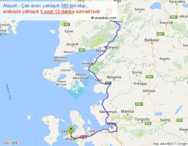 Alaçati - Çan arası yaklaşık olarak 90 km/h ile yukarıda belirtilen sürede olup, iki yerin kuş uçuşu uzaklığı (mesafesi) 201'dir. Yolculuk otobüsle 6 saat 45 dakika sürmektedir.