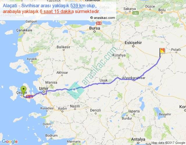 Alaçati - Sivrihisar arası yaklaşık olarak 90 km/h ile yukarıda belirtilen sürede olup, iki yerin kuş uçuşu uzaklığı (mesafesi) 462'dir. Eğer belirtilen yerler arasında uçak seferi var ise bu süre uçakla 42 dakika'ya kadar düşebilir. Yolculuk otobüsle 8 saat 7 dakika sürmektedir.