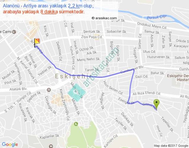 Alanönü - Arifiye arası yaklaşık olarak 90 km/h ile yukarıda belirtilen sürede olup, iki yerin kuş uçuşu uzaklığı (mesafesi) 2'dir. Yolculuk otobüsle 10 dakika sürmektedir.