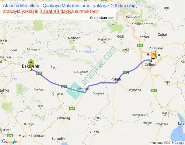 Alanönü Mahallesi - Çankaya Mahallesi arası yaklaşık olarak 90 km/h ile yukarıda belirtilen sürede olup, iki yerin kuş uçuşu uzaklığı (mesafesi) 194'dir. Yolculuk otobüsle 3 saat 31 dakika sürmektedir.