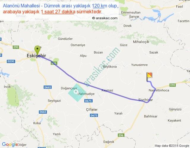 Alanönü Mahallesi - Dümrek arası yaklaşık olarak 90 km/h ile yukarıda belirtilen sürede olup, iki yerin kuş uçuşu uzaklığı (mesafesi) 89'dir. Yolculuk otobüsle 1 saat 53 dakika sürmektedir.