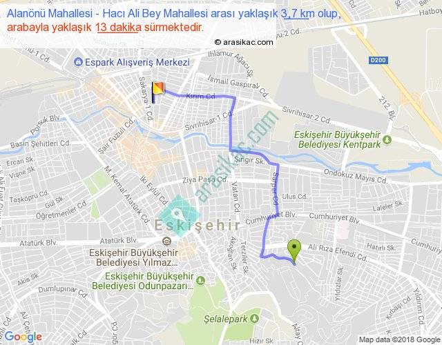 Alanönü Mahallesi - Hacı Ali Bey Mahallesi arası yaklaşık olarak 90 km/h ile yukarıda belirtilen sürede olup, iki yerin kuş uçuşu uzaklığı (mesafesi) 2'dir. Yolculuk otobüsle 16 dakika sürmektedir.