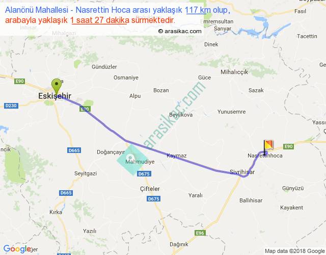 Alanönü Mahallesi - Nasrettin Hoca arası yaklaşık olarak 90 km/h ile yukarıda belirtilen sürede olup, iki yerin kuş uçuşu uzaklığı (mesafesi) 99'dir. Yolculuk otobüsle 1 saat 53 dakika sürmektedir.