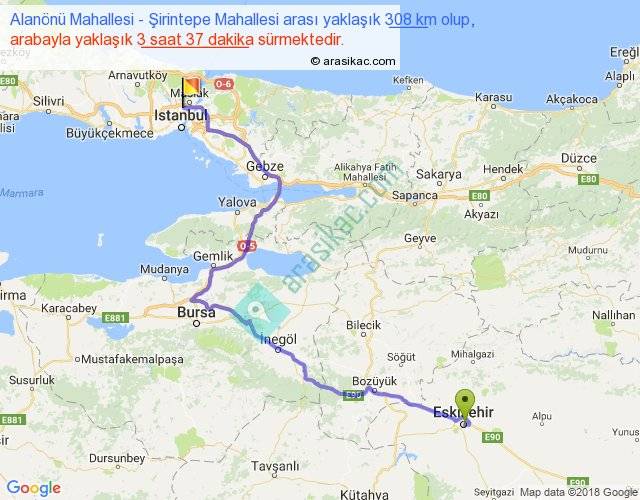 Alanönü Mahallesi - Şirintepe Mahallesi arası yaklaşık olarak 90 km/h ile yukarıda belirtilen sürede olup, iki yerin kuş uçuşu uzaklığı (mesafesi) 196'dir. Yolculuk otobüsle 4 saat 42 dakika sürmektedir.
