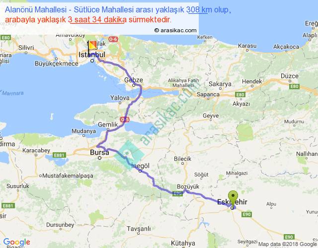 Alanönü Mahallesi - Sütlüce Mahallesi arası yaklaşık olarak 90 km/h ile yukarıda belirtilen sürede olup, iki yerin kuş uçuşu uzaklığı (mesafesi) 196'dir. Yolculuk otobüsle 4 saat 38 dakika sürmektedir.