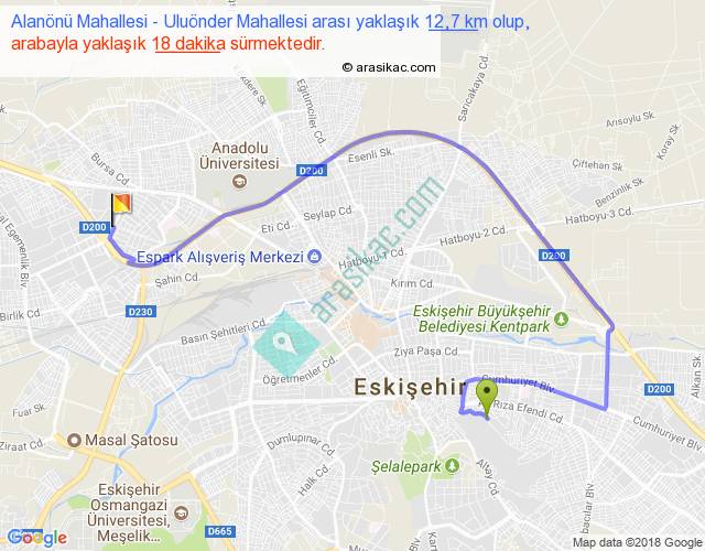 Alanönü Mahallesi - Uluönder Mahallesi arası yaklaşık olarak 90 km/h ile yukarıda belirtilen sürede olup, iki yerin kuş uçuşu uzaklığı (mesafesi) 6'dir. Yolculuk otobüsle 23 dakika sürmektedir.