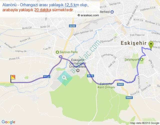 Alanönü - Orhangazi arası yaklaşık olarak 90 km/h ile yukarıda belirtilen sürede olup, iki yerin kuş uçuşu uzaklığı (mesafesi) 8'dir. Yolculuk otobüsle 26 dakika sürmektedir.