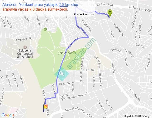 Alanönü - Yenikent arası yaklaşık olarak 90 km/h ile yukarıda belirtilen sürede olup, iki yerin kuş uçuşu uzaklığı (mesafesi) 2'dir. Yolculuk otobüsle 7 dakika sürmektedir.