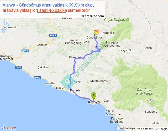 Alanya - Gündoğmuş arası yaklaşık olarak 90 km/h ile yukarıda belirtilen sürede olup, iki yerin kuş uçuşu uzaklığı (mesafesi) 30'dir. Yolculuk otobüsle 2 saat 11 dakika sürmektedir.