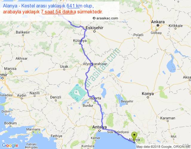 Alanya - Kestel arası yaklaşık olarak 90 km/h ile yukarıda belirtilen sürede olup, iki yerin kuş uçuşu uzaklığı (mesafesi) 8'dir. Yolculuk otobüsle 23 dakika sürmektedir.