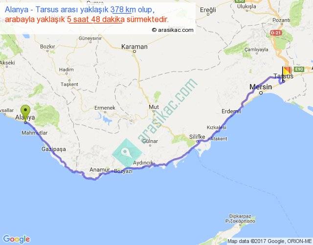 Alanya - Tarsus arası yaklaşık olarak 90 km/h ile yukarıda belirtilen sürede olup, iki yerin kuş uçuşu uzaklığı (mesafesi) 260'dir. Eğer belirtilen yerler arasında uçak seferi var ise bu süre uçakla 24 dakika'ya kadar düşebilir. Yolculuk otobüsle 7 saat 32 dakika sürmektedir.