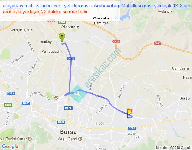 alaşarköy mah. istanbul cad. şehirlerarası - Arabayatağı Mahallesi arası yaklaşık olarak 90 km/h ile yukarıda belirtilen sürede olup, iki yerin kuş uçuşu uzaklığı (mesafesi) 10'dir. Yolculuk otobüsle 28 dakika sürmektedir.