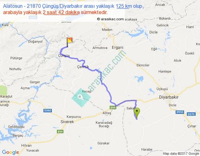 Alatosun - 21870 Çüngüş Diyarbakır arası yaklaşık olarak 90 km/h ile yukarıda belirtilen sürede olup, iki yerin kuş uçuşu uzaklığı (mesafesi) 77'dir. Yolculuk otobüsle 3 saat 30 dakika sürmektedir.