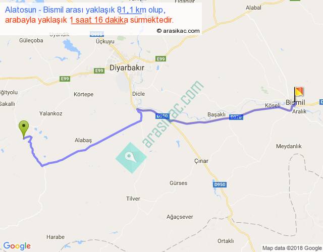 Alatosun - Bismil arası yaklaşık olarak 90 km/h ile yukarıda belirtilen sürede olup, iki yerin kuş uçuşu uzaklığı (mesafesi) 65'dir. Yolculuk otobüsle 1 saat 38 dakika sürmektedir.