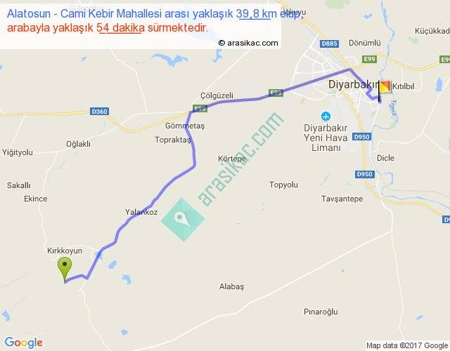 Alatosun - Cami Kebir Mahallesi arası yaklaşık olarak 90 km/h ile yukarıda belirtilen sürede olup, iki yerin kuş uçuşu uzaklığı (mesafesi) 31'dir. Yolculuk otobüsle 1 saat 10 dakika sürmektedir.