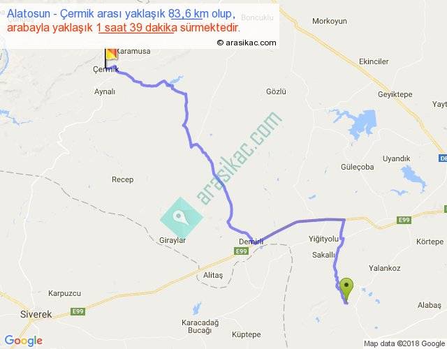 Alatosun - Çermik arası yaklaşık olarak 90 km/h ile yukarıda belirtilen sürede olup, iki yerin kuş uçuşu uzaklığı (mesafesi) 58'dir. Yolculuk otobüsle 2 saat 8 dakika sürmektedir.