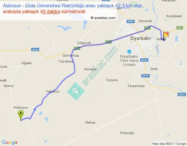 Alatosun - Dicle Üniversitesi Rektörlüğü arası yaklaşık olarak 90 km/h ile yukarıda belirtilen sürede olup, iki yerin kuş uçuşu uzaklığı (mesafesi) 34'dir. Yolculuk otobüsle 1 saat 3 dakika sürmektedir.