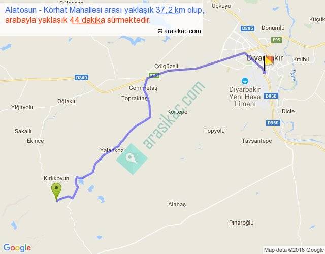 Alatosun - Körhat Mahallesi arası yaklaşık olarak 90 km/h ile yukarıda belirtilen sürede olup, iki yerin kuş uçuşu uzaklığı (mesafesi) 29'dir. Yolculuk otobüsle 57 dakika sürmektedir.