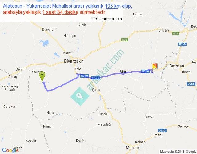 Alatosun - Yukarısalat Mahallesi arası yaklaşık olarak 90 km/h ile yukarıda belirtilen sürede olup, iki yerin kuş uçuşu uzaklığı (mesafesi) 86'dir. Yolculuk otobüsle 2 saat 2 dakika sürmektedir.